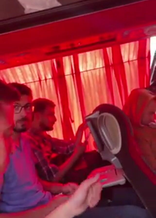 The interior of a bus is lit with red light. Several people are seated in the bus seats. One man is looking at his phone. Another man is looking at the camera and holding his thumb up. The bus has curtains on the windows.