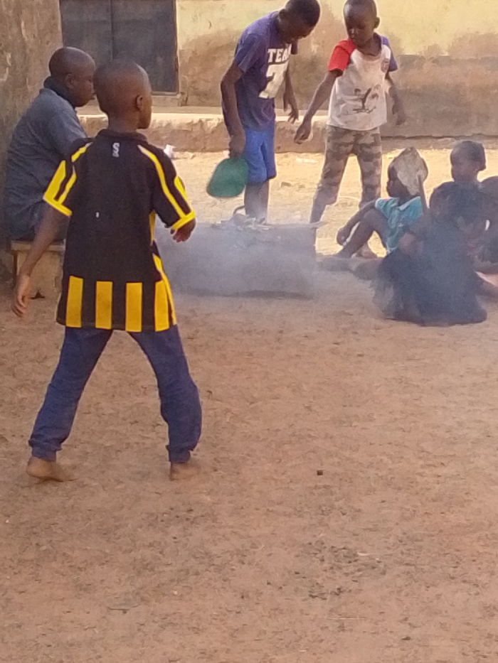 A group of children gather outdoors around a smoky area. One child in the foreground wears a black and yellow striped shirt and blue pants. Another wears a purple shirt and blue shorts, holding a green object. Others sit or stand nearby, including one in a white and red shirt and another with a head covering. An adult sits on a ledge in the background. The ground is dusty.