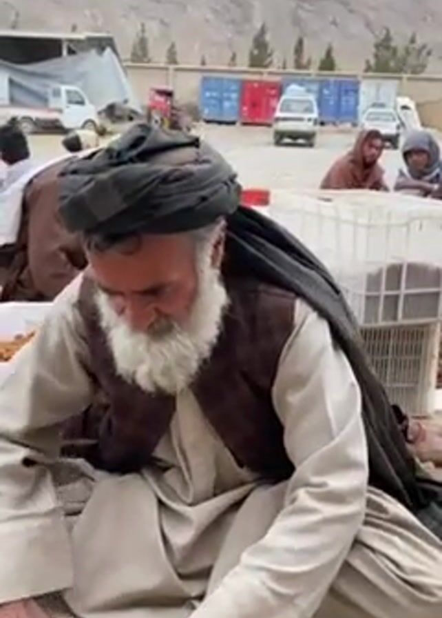 An elderly man with a long white beard and a dark turban sits cross-legged on the ground sorting dried fruit, likely raisins