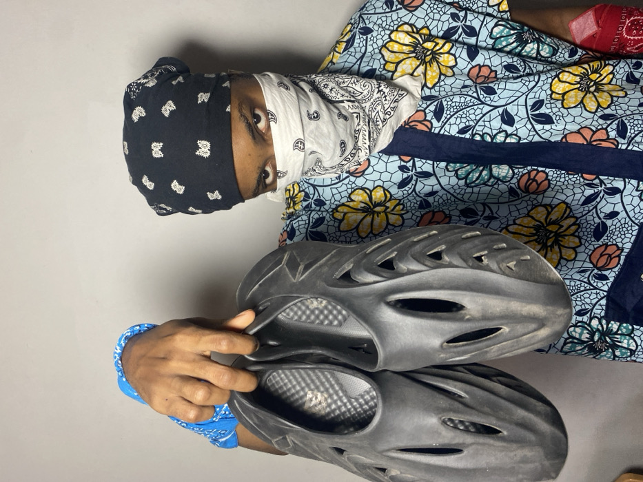 A frontal, waist-up image depicts an individual positioned against a plain, light grey wall. The person's face is partially obscured by a white bandana featuring black paisley patterns, covering the nose and mouth. A black bandana with white paisley patterns is worn on the head. The individual wears a short-sleeved garment with a light blue background, adorned with yellow and orange floral patterns and intricate dark blue geometric designs; a solid dark blue vertical band runs down the center front. A blue bandana is visible on the left wrist. The individual's left hand holds a pair of dark grey, heavily perforated foam clogs/sandals, presenting them towards the camera. The clogs exhibit minor surface dust. The individual's eyes are visible and directed towards the camera. A red patterned fabric is partially visible on the lower right edge of the frame. The specific location within Accra, Ghana, cannot be determined from the visual information provided.