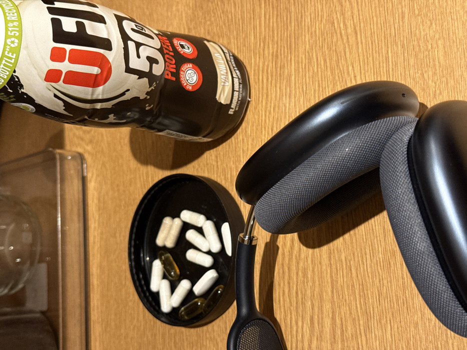 The image depicts a still life scene on a light-colored wooden surface, possibly a table or countertop, in an indoor setting. In the foreground, a pair of black over-ear headphones, resembling Apple AirPods Max, are partially visible, featuring grey mesh earpads and a black metallic exterior. To the left of the headphones, a black circular lid, likely from a container, holds approximately ten white opaque capsules, four translucent amber-colored capsules, and three light brown opaque capsules. To the right, a black uFit 50g Protein shake bottle with "Vanilla" flavor is standing upright. The bottle features white and red branding, including "NO ADDED SUGAR" and "LOW FAT" labels. The background is blurred, showing indistinct shapes including what appears to be a clear glass container and a metallic object. Shadows are cast from the left, suggesting a light source in that direction. The specific location within Mid Suffolk, United Kingdom, cannot be determined from the visual evidence provided in the image.