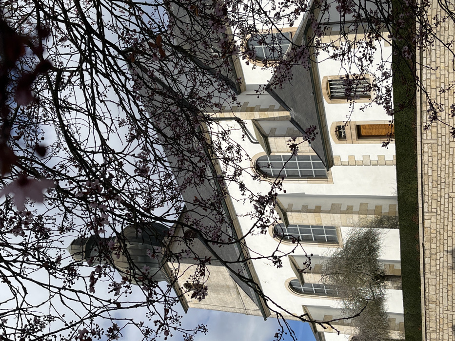 - "The image displays a large, white stuccoed building, identified as being in Mondercange, Luxembourg, partially obscured by a foreground network of dark, bare tree branches adorned with numerous small pink blossoms" by FM-CPrh43, licensed under CC BY 4.0