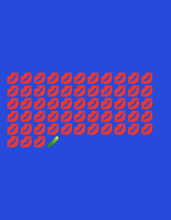 A blue background displays an array of red lip prints arranged in a grid-like pattern. The lip prints appear uniform in size and shape. In the lower-left quadrant, a single green cucumber disrupts the pattern, standing out against the sea of red lips and blue backdrop. The contrast between the cucumber and the surrounding elements creates a focal point within the image.