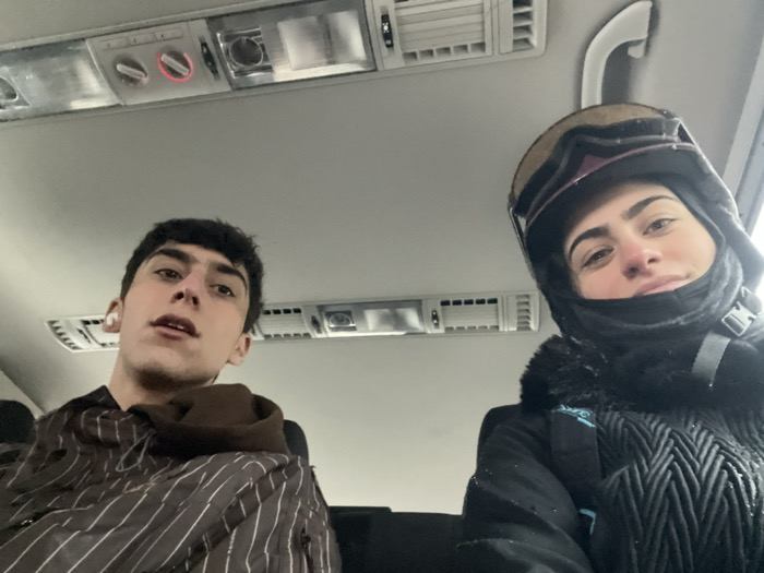 Two individuals are depicted inside the passenger compartment of a vehicle, consistent with a bus or shuttle, in Breuil-Cervinia, Italy. The male subject, positioned on the left, has dark hair, an open mouth, and wears a brown and white striped hooded jacket with a white earbud visible in his left ear. The female subject, on the right, wears a dark ski helmet with goggles pushed up, a black balaclava covering her neck and lower face, and a black textured ski jacket featuring a faux fur trim; she displays a slight smile. Both subjects, estimated to be in their late teens or early twenties, are looking towards the camera. The vehicle's interior ceiling, visible above them, features integrated lighting fixtures, air vents, and control panels, one with a red indicator. The subjects' attire suggests engagement with winter sports activities.