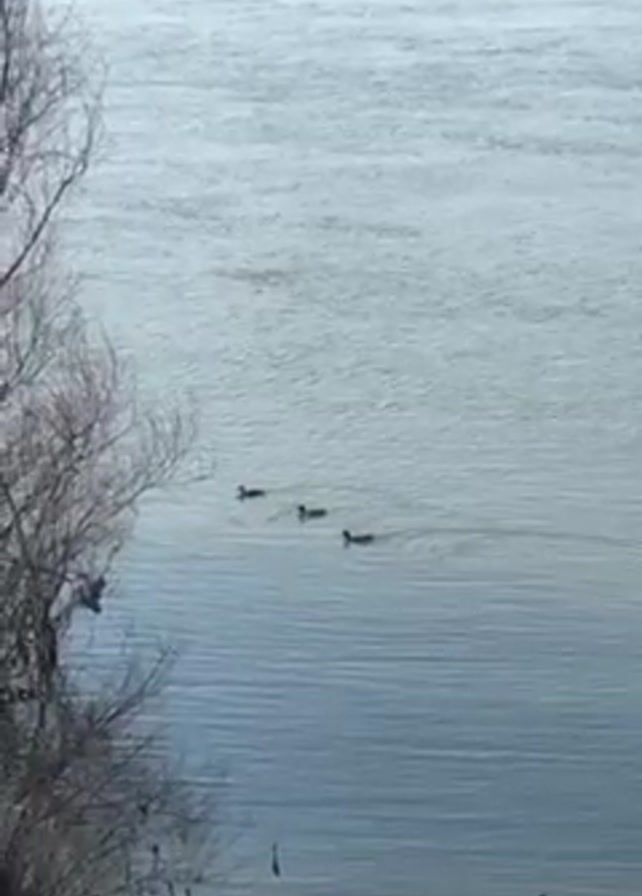 body of water, possibly a river, with three ducks swimming in the distance. A tree with bare branches is visible on the left side of the frame. The water appears calm, with slight ripples on the surface. The scene is shot from a high vantage point.