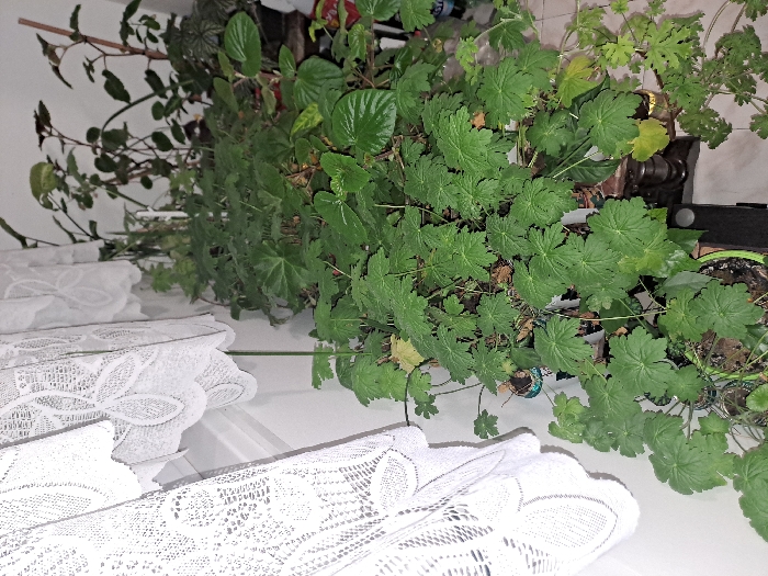 This image depicts an indoor scene in the city of Slivnitsa, Bulgaria. The primary subject is a dense arrangement of assorted potted houseplants situated adjacent to a window. On the left, a section of white, lace curtains, featuring a repeating floral pattern, hangs vertically, partially obscuring a light-colored wall. A robust collection of green foliage occupies the center and right portions of the frame. This includes several large-leafed plants, consistent with Pelargonium species, in the foreground and mid-ground, some exhibiting minor leaf discoloration. Various other plant types, including those with smaller or patterned leaves, are visible throughout the density of the growth. The plants are contained within assorted pots of differing colors, including dark and light tones, with one pot in the lower-left displaying a prominent green rim. A dark, rectangular object, consistent with a shelf or stand, is partially visible beneath some plants in the lower-mid section. Small, dark, unidentifiable objects are interspersed among the foliage. No individuals are present, and no actions or interactions are depicted within the scene.