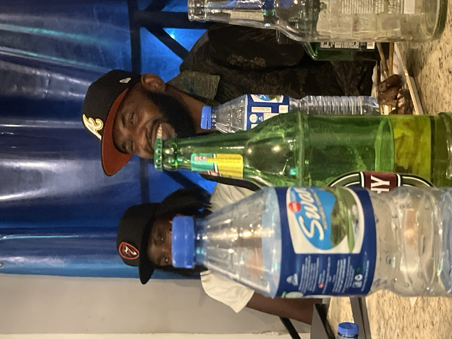 Two people are at a table covered with various bottles, including beer and water. One person wears a black baseball cap with a red brim and an "A" logo, while the other wears a black baseball cap with a brown brim and a different logo. Both are smiling and appear to be enjoying themselves. The background features a blue fabric.