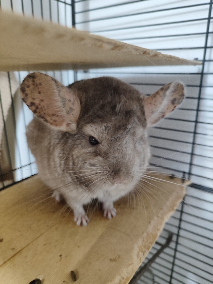 - "A grey chinchilla with prominent ears is perched on a wooden platform inside a cage" by FM-pJyc73, licensed under CC BY 4.0