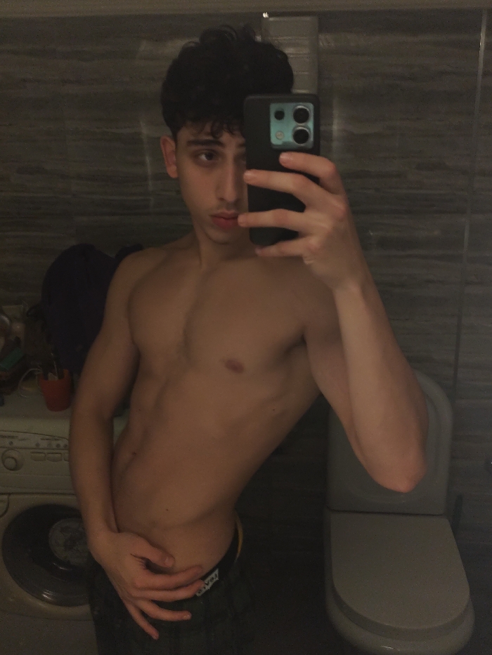 A shirtless young man takes a selfie in a bathroom