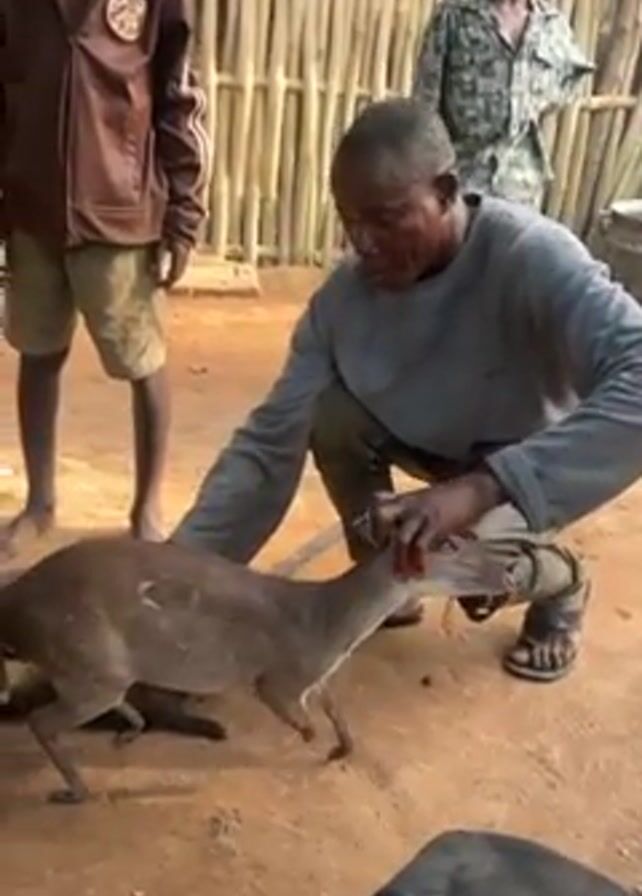 In an outdoor setting with a bamboo-style fence in the background, a man is crouching and holding the head of a small brown deer-like animal