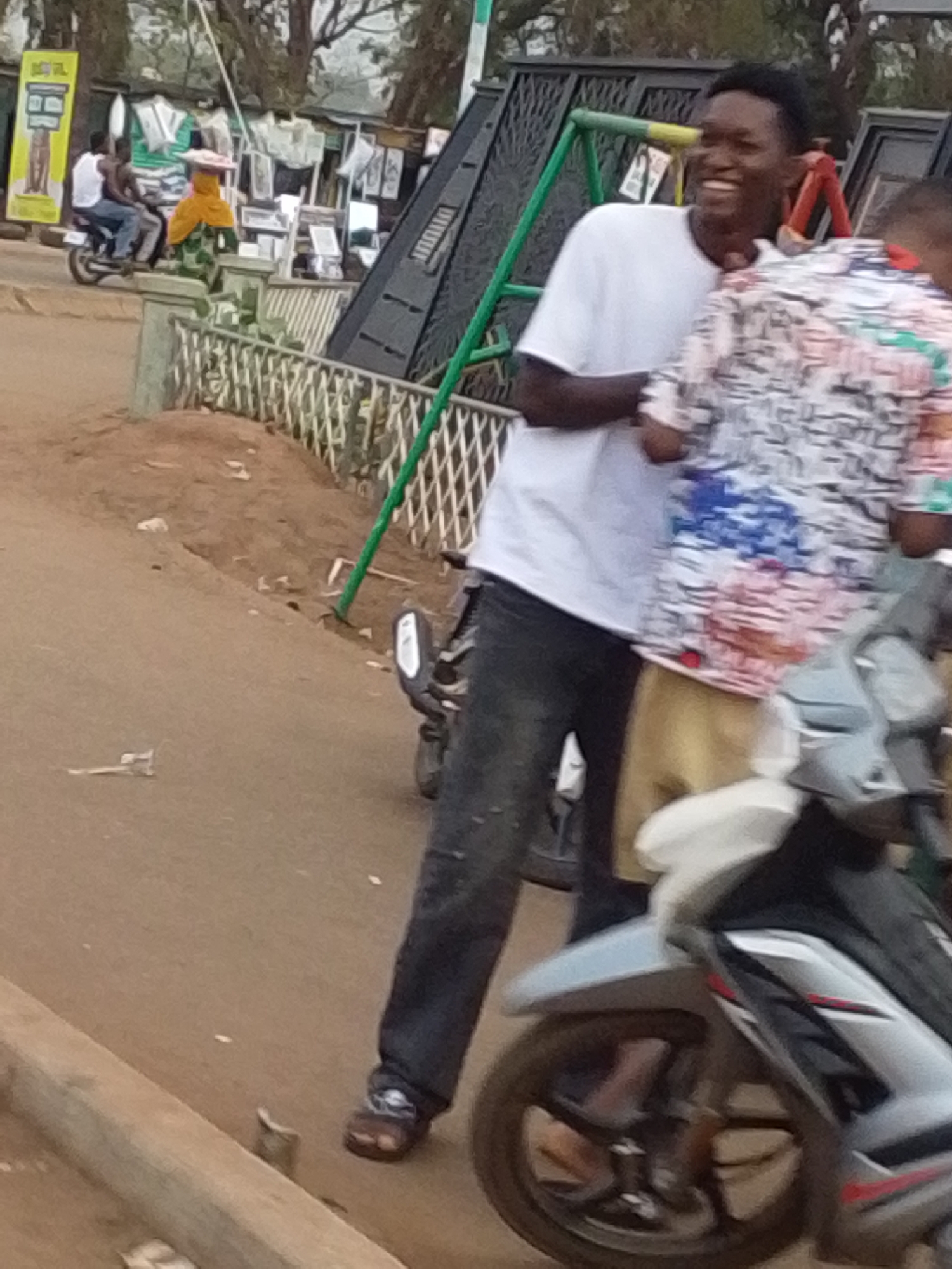 In a daytime outdoor scene, a smiling, dark-skinned young man stands on a road in Tamale, Ghana. He wears a white short-sleeved t-shirt and dark jeans, with sandals on his feet. The man is positioned next to another individual wearing a colorful button-up shirt and tan shorts, partially obscured by the foreground. In front of the two men is a parked silver and black moped or small motorcycle, angled towards the right of the frame. Behind the men is a green and black metal structure, potentially playground equipment. In the background, there's a glimpse of a road with a motorcycle carrying two passengers and a woman with an item on her head, along with a vendor stall. A yellow sign is visible on the left side of the frame. The ground surface appears to be sandy or dirt, characteristic of the urban environment.