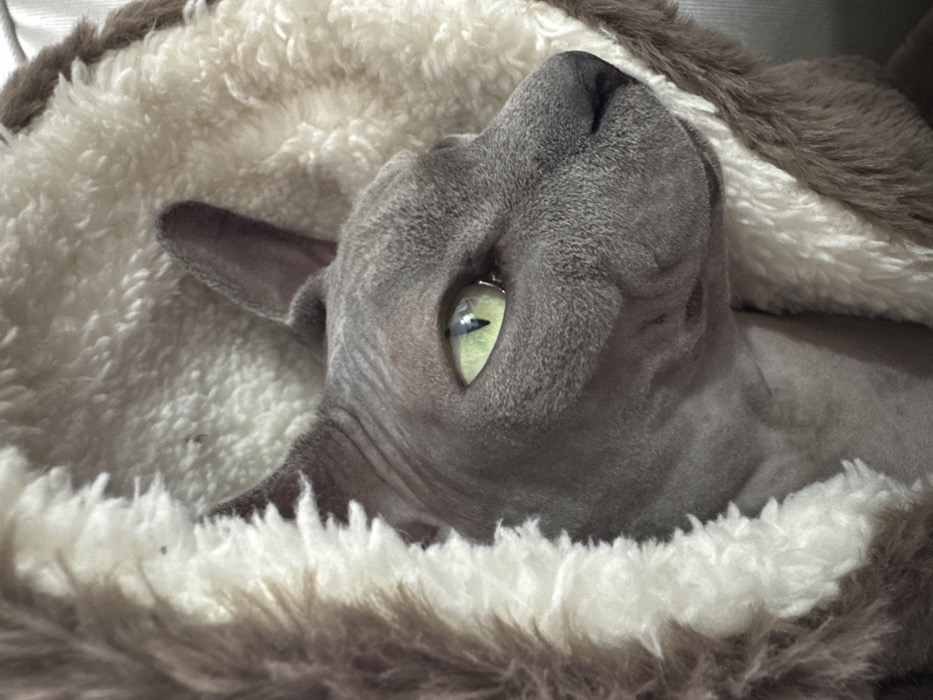 - "A gray Sphynx cat rests in a plush, furry bed" by FM-4WEif2, licensed under CC BY 4.0