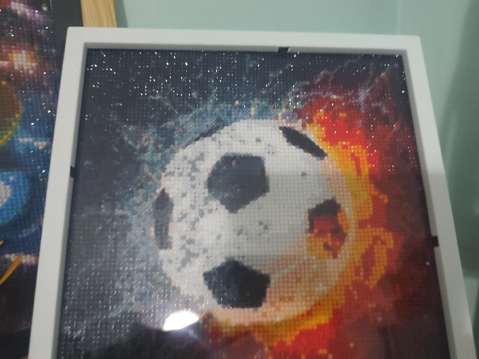 - "This image presents a framed diamond painting, depicting a soccer ball against a dual-themed background" by FM-j9kEo2, licensed under CC BY 4.0