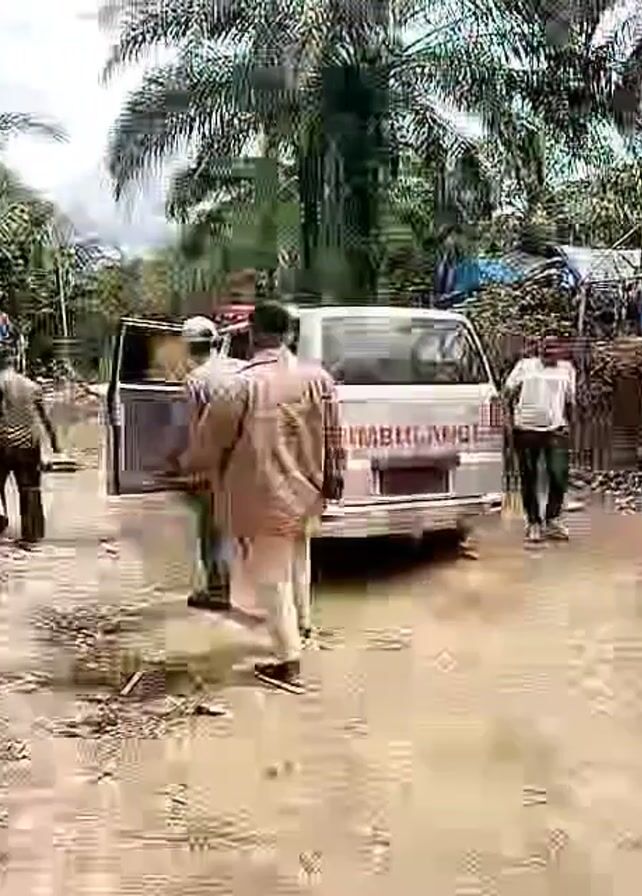 A medium shot shows the rear view of a white ambulance parked on a dirt road surrounded by palm trees and other vegetation. Four men are visible. One man exits the open side door of the ambulance, while another man in a tan jacket stands nearby with his back to the camera. A third man in a white shirt and dark pants stands to the right of the ambulance, looking at his phone. A fourth man walks away from the scene on the left side, carrying a white bag. The environment appears to be a rural or tropical area with sparse structures visible in the background. The dirt road is uneven with visible debris. The sky is overcast, casting soft lighting on the scene.
