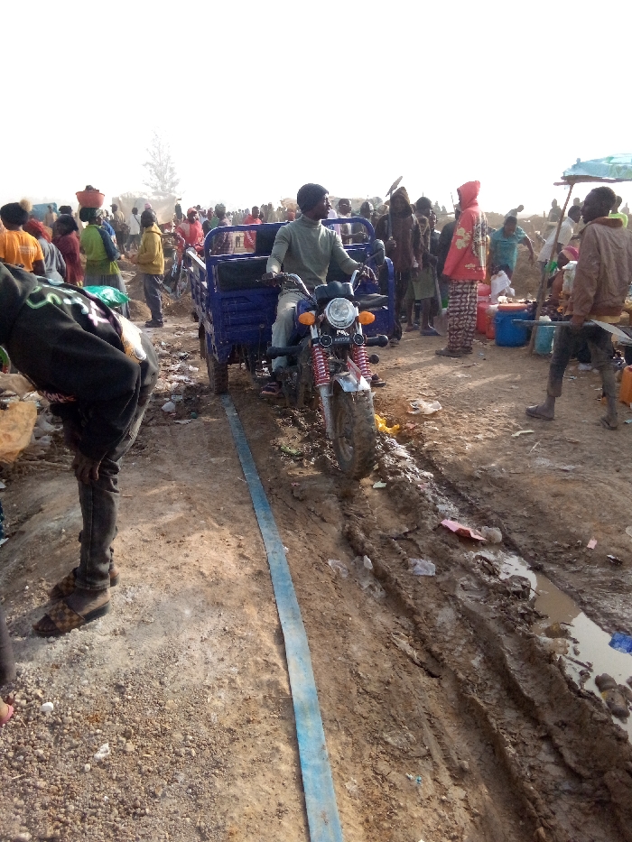 A three-wheeled motorcycle navigates a muddy road in a crowded outdoor market. The bike is blue with a red motorcycle front. People surround the bike, some carrying items on their heads. The ground is uneven with puddles and debris scattered. A flat blue hose lies along the path, likely used for water access in the bustling market. The scene appears to depict a daily activity in a busy, possibly impoverished, setting.