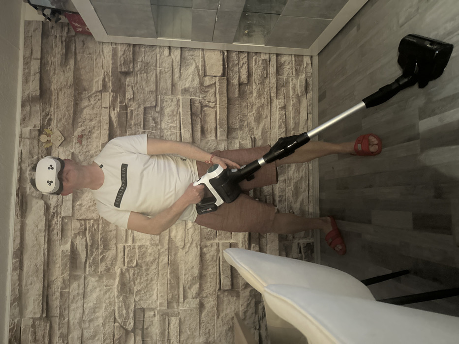 - "An adult male stands centrally in an indoor residential setting, holding a black and silver cordless stick vacuum cleaner with a Bosch 18V battery pack" by FM-7Mx5V2, licensed under CC BY 4.0