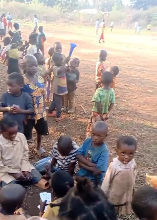 group of children gathered on a dirt field, watching a soccer game in the background. Some children are sitting on the ground, while others stand, looking toward the soccer field. The field is surrounded by trees, small buildings and a mountain range. Some of the children are holding objects in their hands, such as a toy horn and possibly a piece of paper. The children appear to be of African descent, and their clothing is varied.