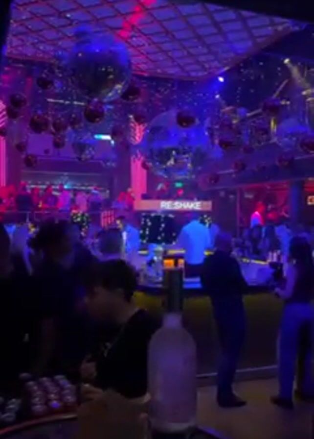 crowded nightclub. The room is decorated with disco balls and illuminated by red and blue lighting. In the foreground, a table has a bottle of liquor and a rack of shot glasses. Several people are visible near the bar, and others appear to be dancing in the background. A sign reads "RE:SHAKE". One man is wearing a black shirt with a white number "7".