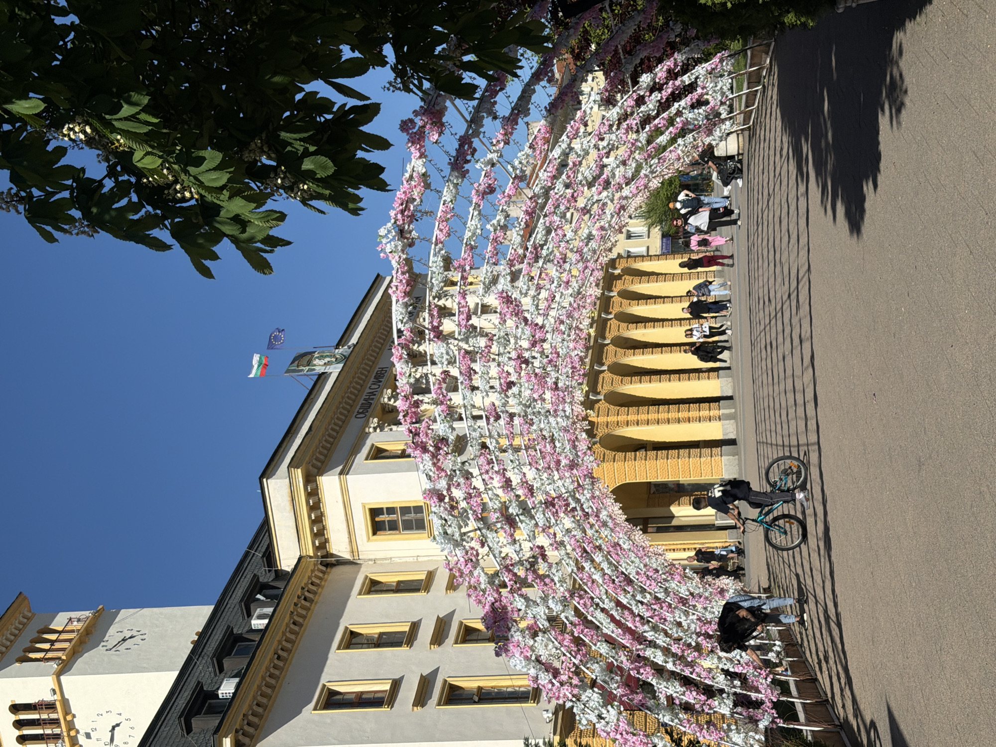 - "The image depicts a scene in Sliven, Bulgaria, showing the city hall building (Община Сливен) adorned with an extensive arched floral display made of white and pink blossoms, likely for a celebration or event" by FM-bAEwg1, licensed under CC BY 4.0