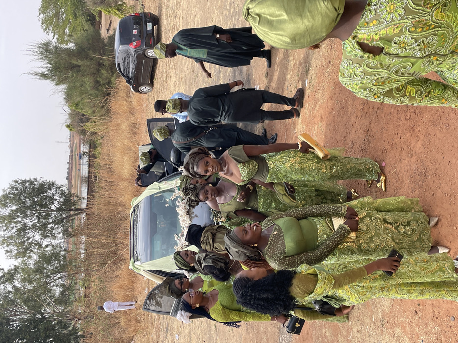 The image depicts an outdoor gathering in Nabatum, Nigeria, on an unpaved reddish-brown dirt surface under clear daylight conditions. A dark-colored sedan is positioned centrally, adorned with light green fabric draped over its roof and hood, and a white floral arrangement on the hood. The front and rear left passenger doors, as well as the rear right passenger door, are open. Approximately fifteen individuals are visible. The majority are women, primarily located in the foreground and mid-ground, dressed in coordinated traditional Nigerian attire (aso-ebi) in varying shades of lime and olive green, many with gold embroidery and matching head wraps (gele). Some women hold clutches, handbags, or mobile phones. Several men are present in the mid-ground and background, predominantly wearing dark green or black traditional outfits, some with matching caps. One man in a dark green outfit gestures to his right. A man in a light blue shirt is visible further back. In the far-left background, a lone man in white attire stands near dry vegetation. A black compact car is parked to the right of the decorated sedan. The background consists of sparse, dry brown brush, scattered green trees, and a distant body of water with a bridge visible over it.