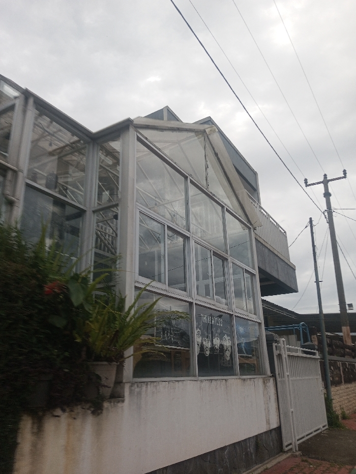 The image depicts a multi-story building located in Suddepalle, India, under an overcast sky. The structure features a prominent glass and metal-framed facade, suggestive of a conservatory or greenhouse design, particularly on its upper levels. The glass panels reflect the cloudy sky and internal structural elements. On the lower section of the building's front, a white poster featuring black silhouettes of four men and the text "THE BEATLES" is affixed to a glass panel. Below the glass, the building transitions to a white-painted wall with a dark stone or tile base. To the left, dense green foliage, including potted plants and vines, grows along the building's base, with a single red flower visible within the greenery. To the right, a white metal gate, possibly a pedestrian entrance, stands next to a low stone wall. Further to the right and receding into the background, a dark utility pole supports multiple overhead power lines that stretch across the upper right portion of the frame. An upper-level balcony with a white railing is visible on the right side of the main building, extending from a more solid, dark-colored section of the structure. No individuals are present in the scene, and no explicit actions or interactions are observed.