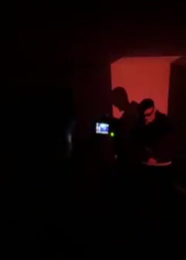 The scene is a dark room, likely indoors. A person wearing sunglasses and a dark jacket stands in front of a wall illuminated with a square of blue light. The person appears to be dancing or moving to music. The silhouette of the person is also visible on the wall. In the foreground, another individual is recording the scene with a camera or smartphone. The overall atmosphere is dimly lit and focused on the person being recorded.