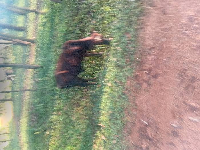 A reddish-brown animal, possibly a cow or deer, lies in green grass next to a dirt path. A wooden fence is visible on the left. The scene appears blurry, indicating motion or a shaky camera. The composition is primarily horizontal, with the animal situated in the middle ground. The path on the right contrasts with the green grass, creating a visual separation in the landscape.