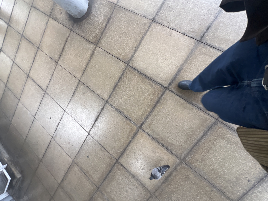 The image, captured from an elevated perspective, depicts an urban outdoor or semi-outdoor scene in the city of Unknown, Unknown. The primary subject is a tiled ground surface composed of light-colored, square, worn tiles with dark grout lines, exhibiting signs of dampness in the upper-left corner. A white horizontal object, possibly a ventilation unit or grate, is mounted on a wall in the upper-left background. A light grey cylindrical base, likely a pillar or pipe, is visible in the upper-right. A human subject is partially visible, from the waist down, occupying the lower half of the frame. This individual wears dark blue jeans, a belt with a metallic buckle, and a dark-colored shoe on their right foot, which is positioned slightly forward. A brown and white striped object, possibly a bag or part of a garment, is visible on the left, and a dark brown garment or object is on the right. Approximately in the upper-left quadrant, a single grey pigeon is standing on the tiled ground, facing towards the left side of the frame. The human subject appears to be standing or walking. No direct interaction between the human and the pigeon is evident.