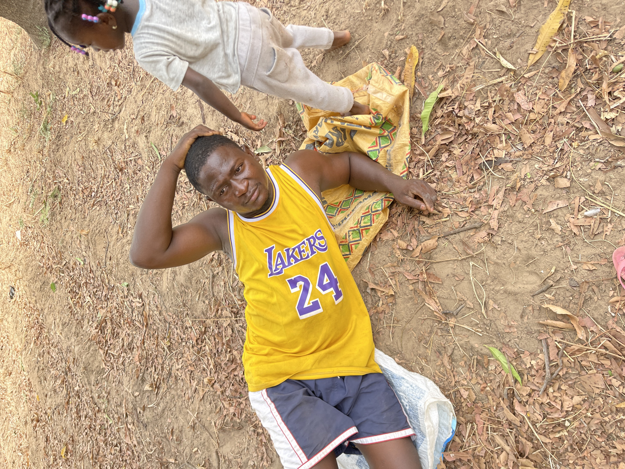 The scene depicts an outdoor setting in Akwanga, Nigeria, characterized by dry, reddish-brown earth covered extensively with fallen, desiccated leaves and small twigs. One adult male and one young child are present. The adult male, with a dark complexion, is lying on his left side, propped on his left elbow, with his right hand resting behind his head. He is wearing a yellow sleeveless jersey with "LAKERS" printed in purple vertically along the right side and the number "24" in purple prominently on the chest. He also wears dark blue shorts with white and red stripes along the outer seams. He rests partially on a crumpled white synthetic sack and a folded yellow and multi-colored patterned fabric, which serves as a mat. His gaze is directed towards the camera. A young child, appearing to be female with braided hair adorned with multiple colorful beads, stands facing the adult male, with her back largely to the viewer. She wears a light-colored (possibly off-white or light grey) short-sleeved t-shirt with a light blue trim around the collar and light grey sweatpants. She is barefoot. The ground around them is uneven, with visible small mounds and depressions. A few sparse green leaves are scattered among the dry foliage. In the lower right corner, a portion of a pink open-toed sandal is visible. No other structures or identifying features of the immediate surroundings are discernible beyond the ground cover and a hint of a tree trunk in the upper background.