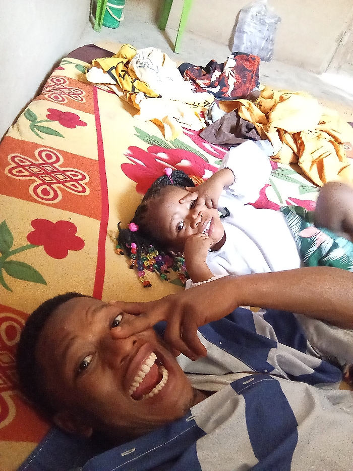 The image displays an adult male and a young female child lying supine on a patterned mattress in an indoor setting within Erin-osun, Nigeria