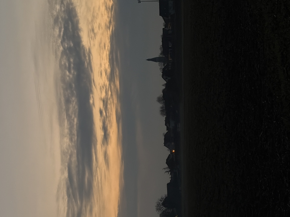 An overcast sky with dramatic, layered clouds illuminated by a pale golden light dominates the left side. The right side shows a dark landscape, likely a field or open area. A silhouette of a town skyline emerges against the sky, featuring rooftops and a prominent church spire. A few bare trees are visible along the skyline, and a single light glows in a distant window. The overall atmosphere is muted and subdued.