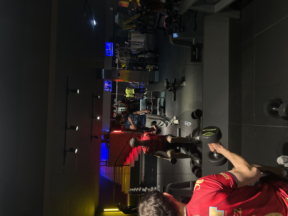 A gym scene is captured through a mirror's reflection. Individuals engage in weightlifting, with one person prominently lifting a dumbbell in the foreground. Gym equipment is visible in the background, including weight machines and dumbbells. The gym's atmosphere is enhanced by illuminated stairs featuring red and blue lighting. Additional people are present, some exercising and others appearing to spot or observe.