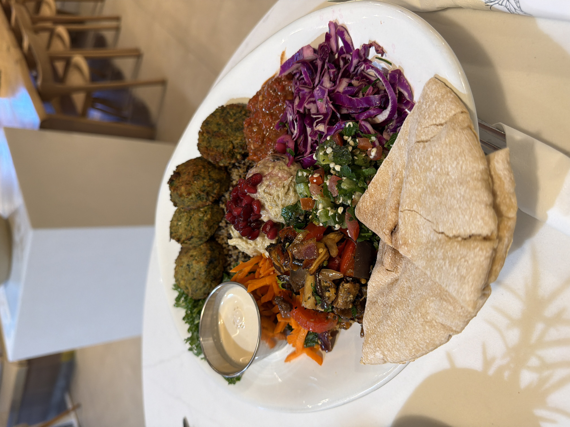 A large, white oval plate of Mediterranean cuisine is centrally displayed on a white marble or quartz-patterned tabletop. The plate contains five round, greenish-brown falafel balls resting on a bed of grains (likely quinoa), accompanied by a small metal cup of creamy white tahini sauce. To the right of the falafel, there is a portion of reddish-orange spicy sauce, and below it, a mound of hummus garnished with dark red pomegranate seeds. Further down, a vibrant green tabbouleh salad is visible, along with a distinct pile of shredded purple cabbage. Roasted mixed vegetables, including eggplant and red bell peppers, are positioned between the hummus and the shredded carrots. Two folded pieces of light brown pita bread are placed at the bottom edge of the plate. The background, out of focus, reveals a modern, brightly lit indoor dining area, consistent with a restaurant or cafe in Las Vegas, United States. To the left, a blurred white rectangular structure, possibly a counter or partition, is visible. To the right, a long wooden dining table is partially seen with several light-colored wooden chairs, each featuring a curved backrest. The flooring appears to be a light, neutral tone. No individuals are present in the frame.