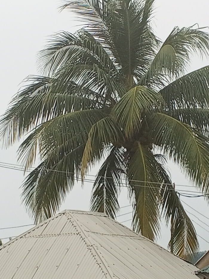 This image depicts a coconut palm tree dominating the upper and central portions of the frame, set against an overcast, light grey sky in Otokiti, Nigeria