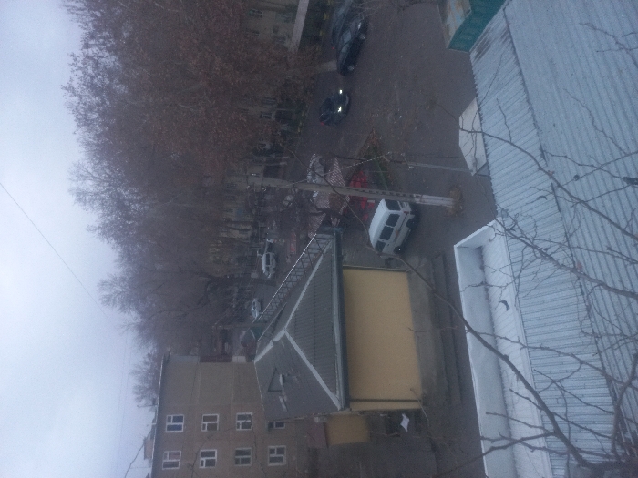 This elevated photograph depicts an urban street scene in Fergana City, Uzbekistan, under an overcast sky. The environment suggests a cooler season, characterized by numerous deciduous trees largely devoid of foliage. On the left side of the frame, a multi-story building, approximately five floors tall, with a light tan or beige facade and multiple white-framed windows, is visible. Below and to its right, a single-story yellow building with a dark, pitched roof stands adjacent to a paved street. The street itself appears damp. A white commercial van is parked near the yellow building. Further along the street, a dark-colored SUV is visible with its headlights illuminated, and a dark sedan is parked nearby. Another lighter-colored sedan is partially visible further down the street on the left. In the immediate foreground, the corrugated metal roofs of two structures are present, one lighter in color and the other dark gray. Bare tree branches partially obscure the bottom and right portions of the frame. A metal railing extends diagonally downwards from the left side of the vantage point. A green, rectangular container is partially visible on the far right. A thin wire traverses the upper portion of the sky. No individuals are discernible within the visible areas of the image.