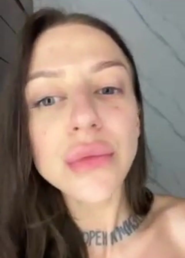 A woman with long brown hair and fair skin is recording a video of herself. She is wearing a black top. Her face is close to the camera, revealing minimal makeup and slight redness around her eyes. A neck tattoo is visible. She raises her hand, briefly covering her face, then examines her face closely, lightly touching her skin around her eye. She is indoors in a room with a white and grey wall.