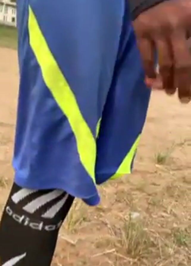 A young man in blue shorts with a yellow stripe and black Adidas socks stands on a grassy field. He wears a long-sleeved black shirt with pink accents. He points to the sky, looking upward and speaking. He appears to be instructing someone or giving directions. The scene cuts to the man walking on the field with others. The ground is a mix of grass and dirt. There is a building in the background.