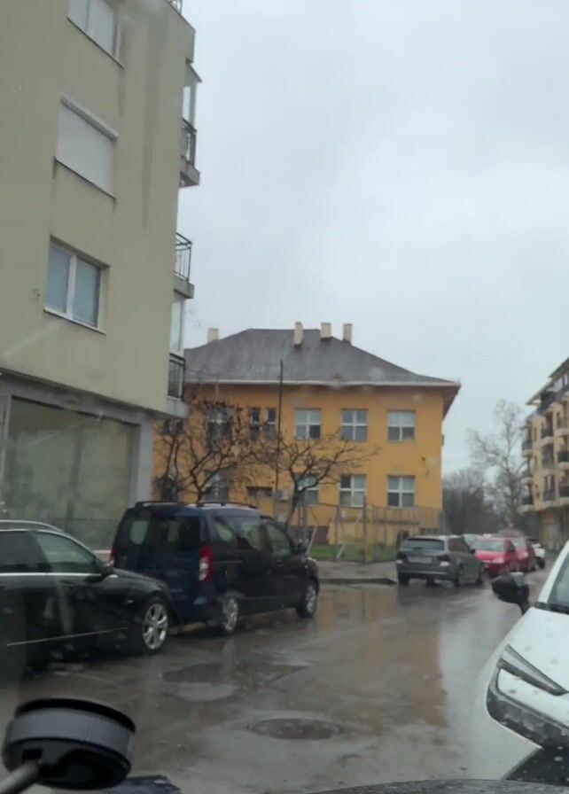 view from inside a car on a rainy day. The first shot looks through the front windshield at a white Toyota car and the street. There are buildings on both sides of the street. The camera then looks out the passenger side window at a yellow building with a sign that says "Бл. Теодора". A black station wagon is parked in front of the building. The camera then turns to the driver, a man wearing a black hooded sweatshirt. He is smiling and looking around.