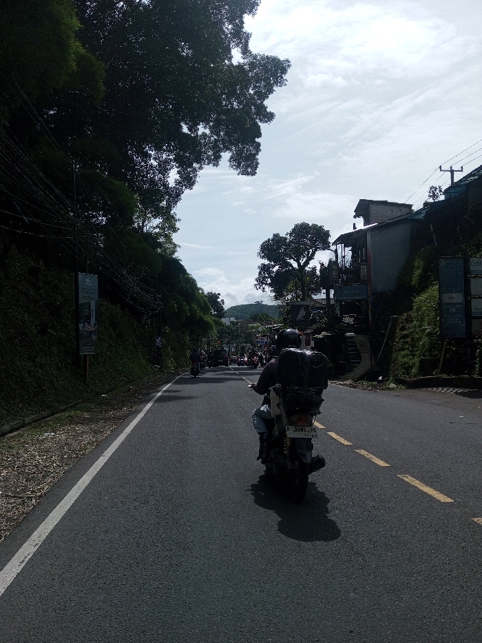 The image displays a daytime road scene in Sandamal Eliya, Sri Lanka, under a bright, partly cloudy sky. An asphalt road, featuring a solid white line on the left shoulder and dashed yellow center lines, recedes into the distance. In the foreground, a dark-colored motorcycle, viewed from behind, travels away from the viewer. The motorcycle's license plate, partially obscured, reads "F 3893 TG" with "11-25" beneath it. The rider wears a dark helmet and dark clothing, and a large, dark, bundled object is secured as cargo to the rear of the motorcycle. A shadow of the motorcycle and rider is cast onto the road to the right. To the left of the road, a steep, green embankment covered in dense vegetation, including bamboo and other trees, rises sharply. Multiple overhead utility wires are visible against the foliage, and several vertical banners are positioned along the base of this embankment. In the midground, a line of other motorcycles and vehicles can be seen traveling in the same direction. To the right, another vegetated slope features a multi-level building with light-colored walls and a dark roof. Additional signs are present near this structure. Distant green hills are visible under the cloud-strewn sky in the background.