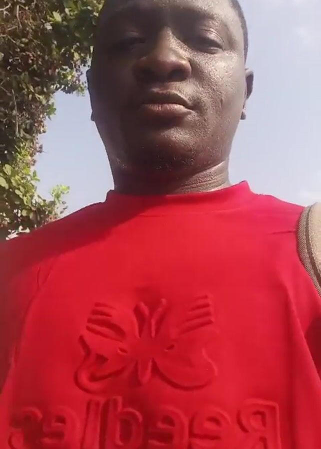 man in a red shirt with a butterfly logo, standing outdoors on a sunny day. He appears to be speaking to the camera. There's a leafy tree behind him on the left, and a glimpse of the sky above. A strap is visible on his right shoulder, suggesting he may be carrying a bag. The camera is positioned at a low angle, looking up at the man.
