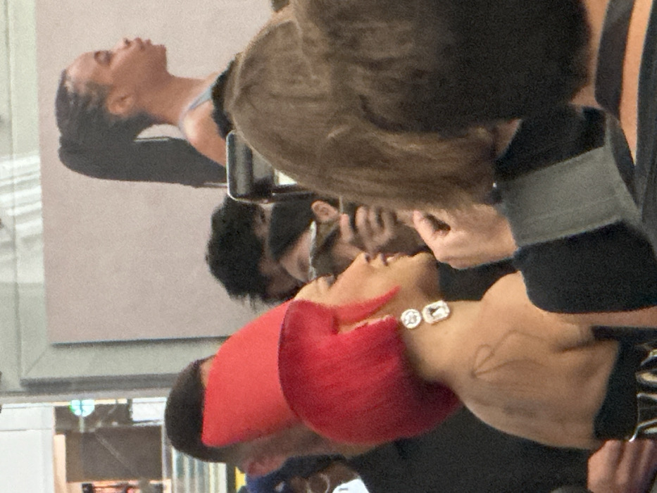 In the city of Glendale, United States, a crowded indoor scene is depicted. The central figure is an adult female with light skin, seen in right profile. She has bright red hair styled in a bob, partially covered by a tall, red, conical headpiece. She wears large, dangling earrings, each comprising a circular and a rectangular clear stone. A dark line-art tattoo, resembling a bow, is visible on her upper right shoulder blade. She is dressed in a black strapless garment and exhibits a slight smile, directing her gaze towards the right. To the immediate left of the central figure, the back of a person's head with short dark hair is visible. In the mid-ground, multiple blurred individuals are present. One individual with dark curly hair is partially seen behind the central figure. Another person, wearing dark sunglasses, holds a dark smartphone or camera elevated, appearing to record or photograph the scene. To the far right, another person with brown, shoulder-length hair is partially visible from behind. In the background, on the right, a young female with dark braided hair in a high ponytail is seen in profile, looking right, wearing a light-colored top. The background features a large, plain light-colored wall and reflective surfaces, indicating a modern indoor public environment such as a mall or event venue.