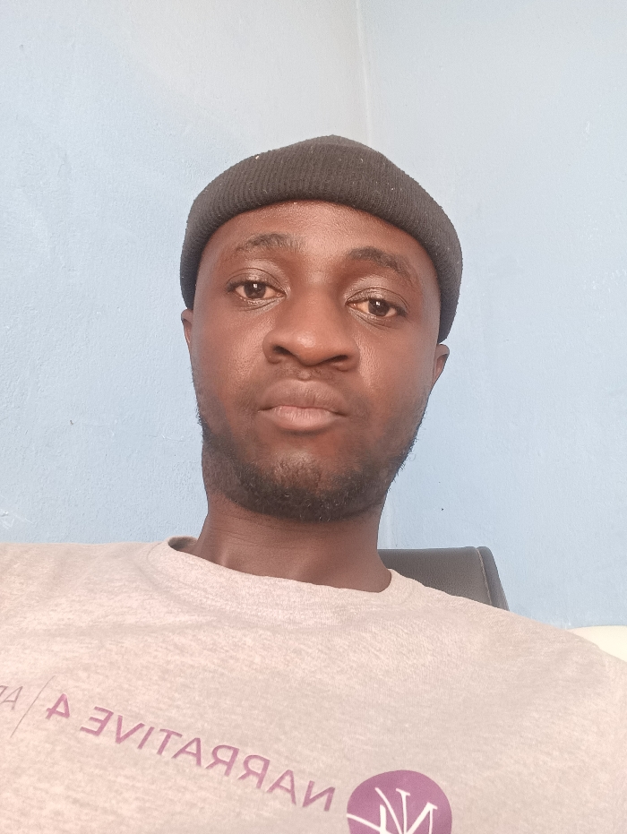 A headshot-style portrait of an adult male is captured indoors. The specific location within the city of Unknown, Unknown, cannot be determined. **Subject:** A male with a dark skin tone, dark eyes, and a short beard/stubble on his jawline and chin. He is wearing a black, ribbed knit beanie and a light grey short-sleeved t-shirt. The t-shirt displays purple text, mirrored, partially reading "NARRATIVE A" followed by a circular logo that appears to feature stylized letters, possibly "NVM". He faces directly forward, looking into the camera with a neutral expression. **Environment:** The background is a plain, light blue wall, suggesting an interior space. A subtle vertical line is visible in the upper right quadrant, potentially indicating an interior corner. A dark grey object, possibly the back of a chair, is visible behind the subject's right shoulder. **Actions:** The subject is stationary, posing for a photograph. No other individuals or interactions are depicted.