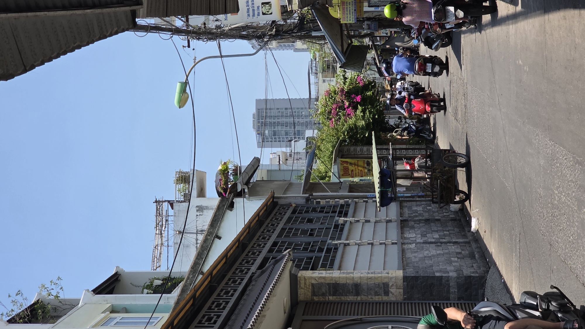 The image depicts a street scene in Tây Nha Trang, Vietnam. The view is from street level, looking down a narrow street. Several motorbikes and scooters are visible, driving on the right side of the road. A vendor's cart is positioned on the side of the road. Overhead, a tangle of electrical wires dominates the skyline. Buildings line the street, with a mix of architectural styles. A taller, modern building can be seen further down the street. The sky is clear and blue.
