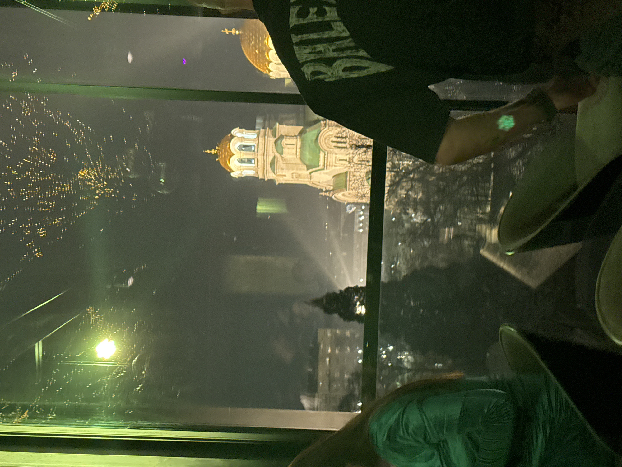 The image presents a nighttime urban scene viewed from an interior, elevated space, likely a restaurant or bar, through a large window in Sofia, Bulgaria. The central focus of the exterior view is the illuminated Alexander Nevsky Cathedral, distinctive with its multiple golden domes and green-patinaed roofs, positioned against a dark sky. Distant city lights are visible, and a dark, pointed coniferous tree stands in the midground. In the foreground, two individuals are partially visible, seated with their backs mostly towards the viewer, observing the city. On the left, a person with dark hair wears a green, possibly satin or silk, garment. On the right, a person wears a dark short-sleeved shirt with "BALENCIAGA" printed in white, distressed lettering on the back. This individual's right forearm displays a distinct glowing green marking or tattoo. Two dark chairs with lighter-colored backs are visible in the immediate foreground. The window glass exhibits multiple reflections: a prominent bright green light source on the far left, and numerous small, yellow, out-of-focus lights scattered across the upper section, indicative of interior decorative lighting or external reflections.