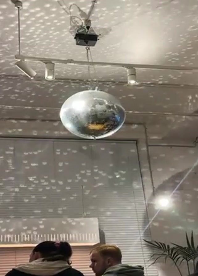 disco ball hanging from the ceiling of a room. The room appears to be a bar or restaurant, with people visible in the foreground. The disco ball is reflecting light onto the ceiling and walls, creating a speckled pattern. There are track lights on the ceiling as well. The disco ball is turning slowly.