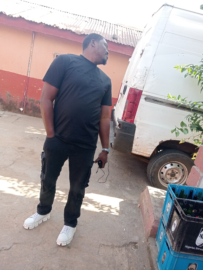 An outdoor scene in Jos, Nigeria, depicts one adult male standing on a light-colored paved surface. The male subject, with short dark hair and a beard, is dressed in a black t-shirt with an embossed logo, black cargo pants, and white platform sneakers. A metallic watch is visible on his left wrist; his left hand is in his pocket, and his right hand holds a small black electronic device with a cord. He faces right and looks slightly upwards. To his right, a white commercial van is partially visible, showing its rear-right section, including a red tail light and a weathered exterior. Below the van, two plastic crates are stacked: a black crate on top, prominently displaying "Nigerian Breweries PLC" branding and containing multiple empty green glass bottles, and a similar blue crate below, also containing bottles. In the background, a reddish-brown building with a corrugated metal roof is visible to the left. Green foliage is present on the far right of the frame. A low red concrete curb borders the paved ground on the right. The scene is illuminated by bright daylight, casting shadows on the ground.