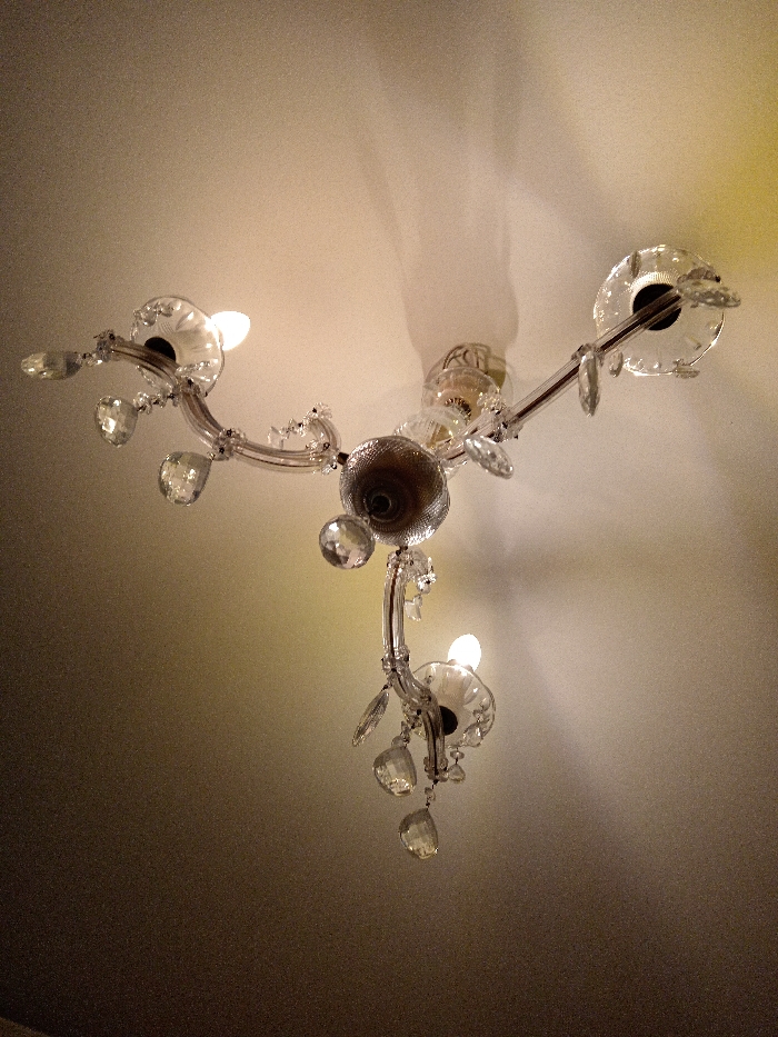 A crystal and glass chandelier is prominently featured, suspended from a light-colored ceiling in Strasbourg, France. The chandelier's central support branches into three curved arms, each culminating in a scalloped clear glass fixture that houses an illuminated, bare incandescent-style light bulb. These bulbs emit a warm, yellowish-white light upwards and outwards. Attached to the chandelier's arms and central frame are multiple clear, faceted crystal or glass teardrop-shaped pendants and smaller decorative bead-like elements. The illumination from the bulbs casts distinct, elongated shadows of the chandelier's structure and its suspended elements onto the ceiling. The ceiling itself appears to be a flat, painted surface with minor textural variations, displaying a gradient of light intensity from brightly illuminated areas directly above the bulbs to progressively darker regions towards the edges of the frame. No individuals or additional objects are visible within the scene. The image is captured from a low-angle perspective, looking directly upward at the ceiling fixture.