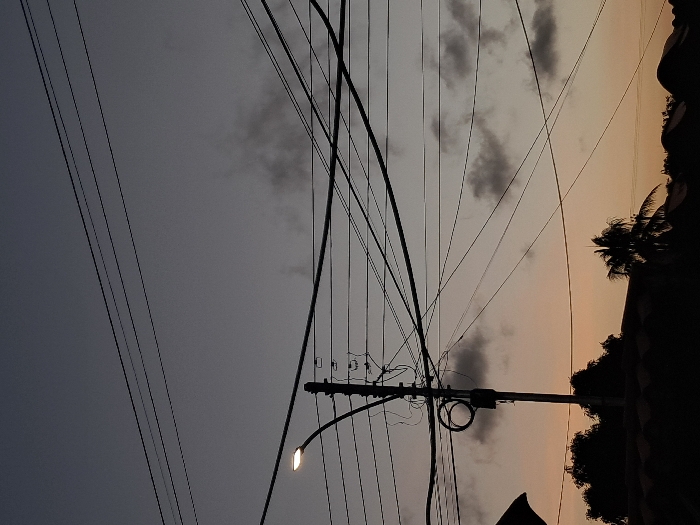 A low-angle shot reveals a dense web of electrical wires against a twilight sky, transitioning from deep gray to pale orange. A utility pole with attached hardware stands prominently, supporting the entangled lines and a lit streetlight. The right side of the frame is dominated by dark silhouettes of trees and rooftops, with a palm tree discernible against the lighter sky. A sense of urban clutter and the quiet beauty of dusk converge in this composition.