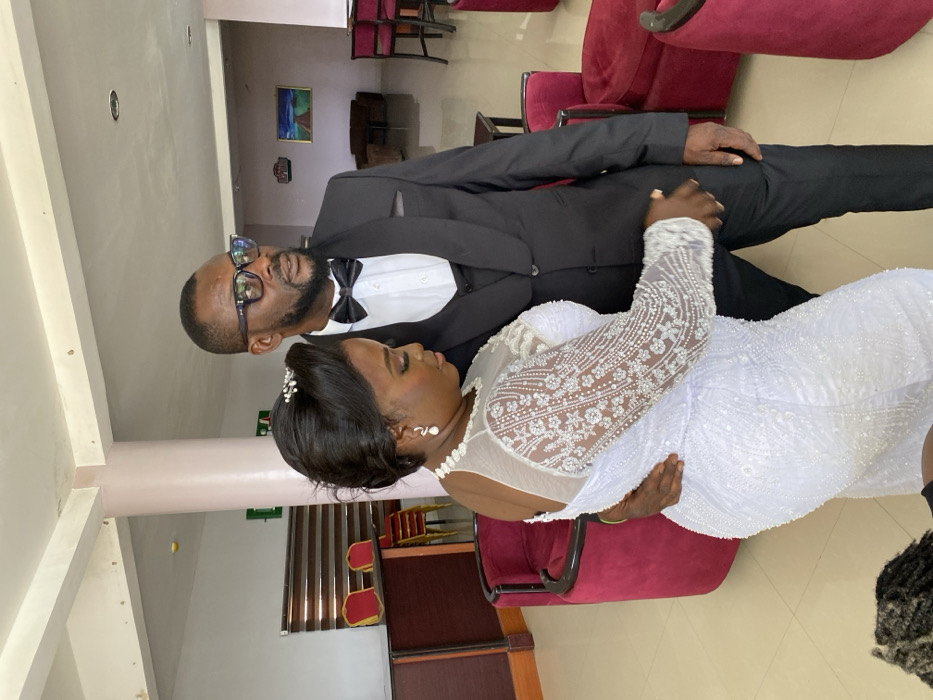 An adult male and an adult female are depicted in a posed, intimate embrace within an interior venue in the city of Kuru Karama, Nigeria