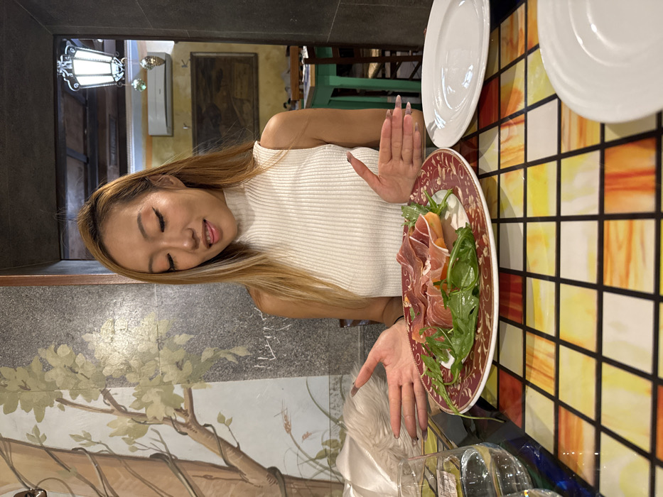 A female is seated at a restaurant table in Rome, Italy. The individual, of East Asian descent with long, blonde-streaked hair, wears a white, ribbed, sleeveless, high-neck top. Her head is slightly tilted, eyes looking downward, and her tongue is partially visible. Both hands are raised and open, palms facing upwards, positioned on either side of a round, red plate containing prosciutto and melon garnished with arugula. The table surface features a prominent yellow, orange, and white checkerboard pattern. A clear drinking glass with water is positioned to the left of the plate, and two empty white oval plates are to the right. The background wall to the left features a painted mural depicting a stylized tree. Through an archway on the right, another section of the restaurant is visible, displaying a hanging ornate white lantern, an air conditioning unit, a dark-framed picture, and green wooden chairs.